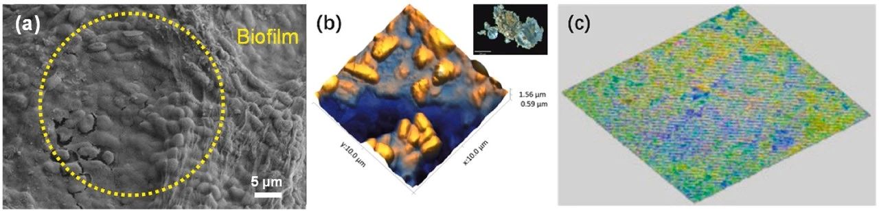 图2 使用SEM、AFM和CLSM等表征技术对微塑料和生物膜进行表征。(a)微塑料上形成的生物膜的SEM图像;(b)菌株ATKU1在微塑料上形成生物膜的AFM高分辨图像;(c)微塑料上生物膜的CLSM图像